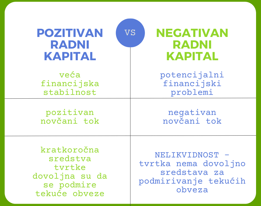Radni kapital je razlika između kratkotrajne imovine i kratkoročnih obveza. Ako tvrtka ima viši iznos kratkoročnih obveza od raspoložive kratkotrajne imovine, tada će radni kapital biti negativan i to ukazuje na potencijalne probleme s likvidnošću, odnosno na to da tvrtka nema dovoljno sredstava da podmiri tekuće obveze.